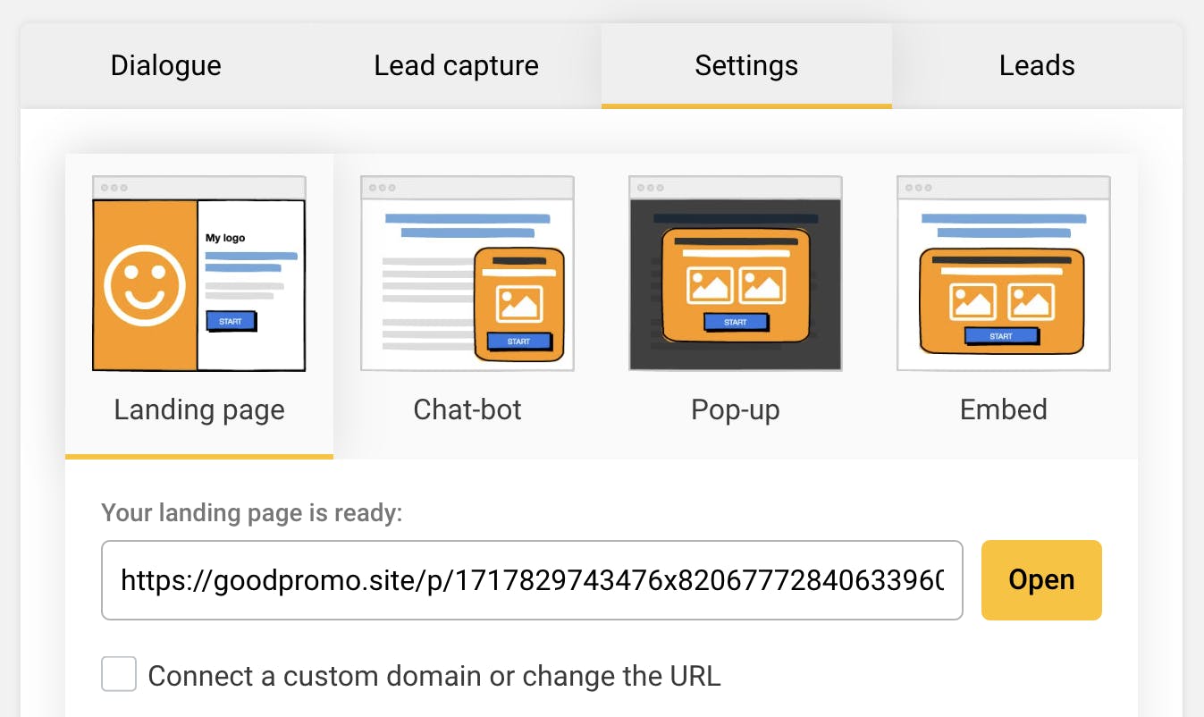 In GoodPromo, you have access to 4 display options: landing page (this entire page was created in GoodPromo), chat-bot version (bottom right corner of the screen), pop-up version, and embedded conversational form on your site (👇 see below)